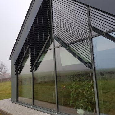 La veneziana obliqua è una soluzione ideale per l’oscuramento delle finestre da forme asimmetriche, nelle quali il telaio superiore non è orizzontale, ma inclinato di un certo angolo. Le lamelle in alluminio copiano l’angolo del telaio superiore e sono parallele ad esso. Le lamelle sono condotte in un cavetto di acciaio. La veneziana comprende un meccanismo speciale che bilancia le distanze diverse dei nastri di tessuto nell’abbassamento e nell’avvolgimento della veneziana. La lista inferiore telescopica serve a bilanciare le larghezze diverse della lista inferiore in posizione inferiore (larghezza della finestra) e in posizione superiore (lunghezza della parte obliqua della finestra). L’altezza bassa della massa di tessuto avvolto si raggiunge grazie all’uso delle lamelle prive della piega longitudinale (sistema Flexi). Per la veneziana obliqua si può usare soltanto la lamella Cetta 80 e solamente il comando a motore.
